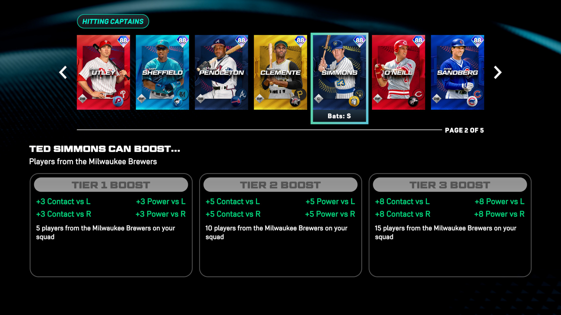 各ラインアップには、Hitting Captain(打者キャプテン) と Pitching Captain(投手キャプテン) をそれぞれ1名ずつ設定できます。これらの Captain カードは、条件を満たす選手に強力な能力ブーストを付与する重要な存在です。Captain Boost を発動できる選手を多く編成するほど、ブーストの効果は強まり、対象となる選手も増えていきます。ラインアップ構築の戦略性がさらに高まります。