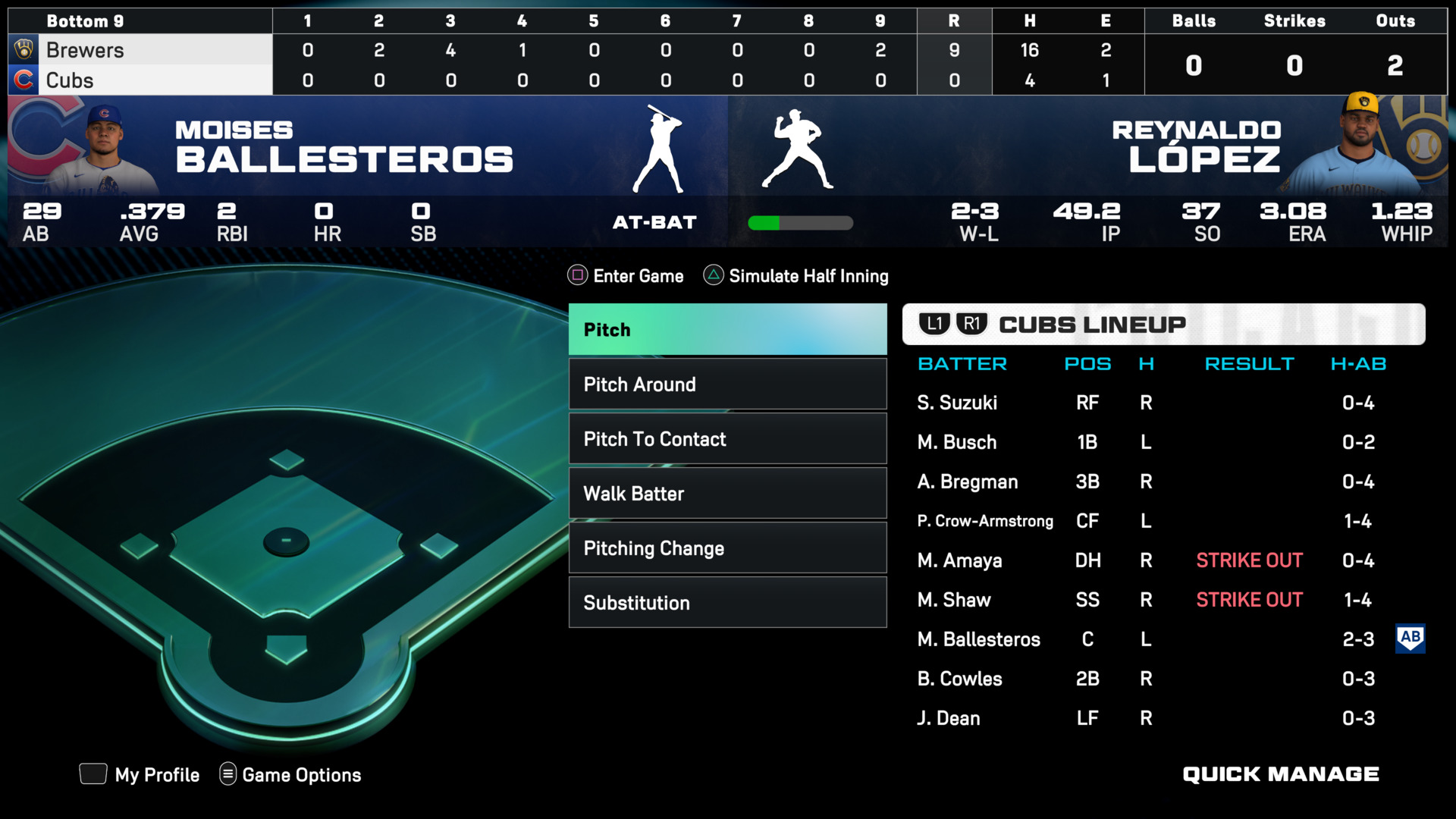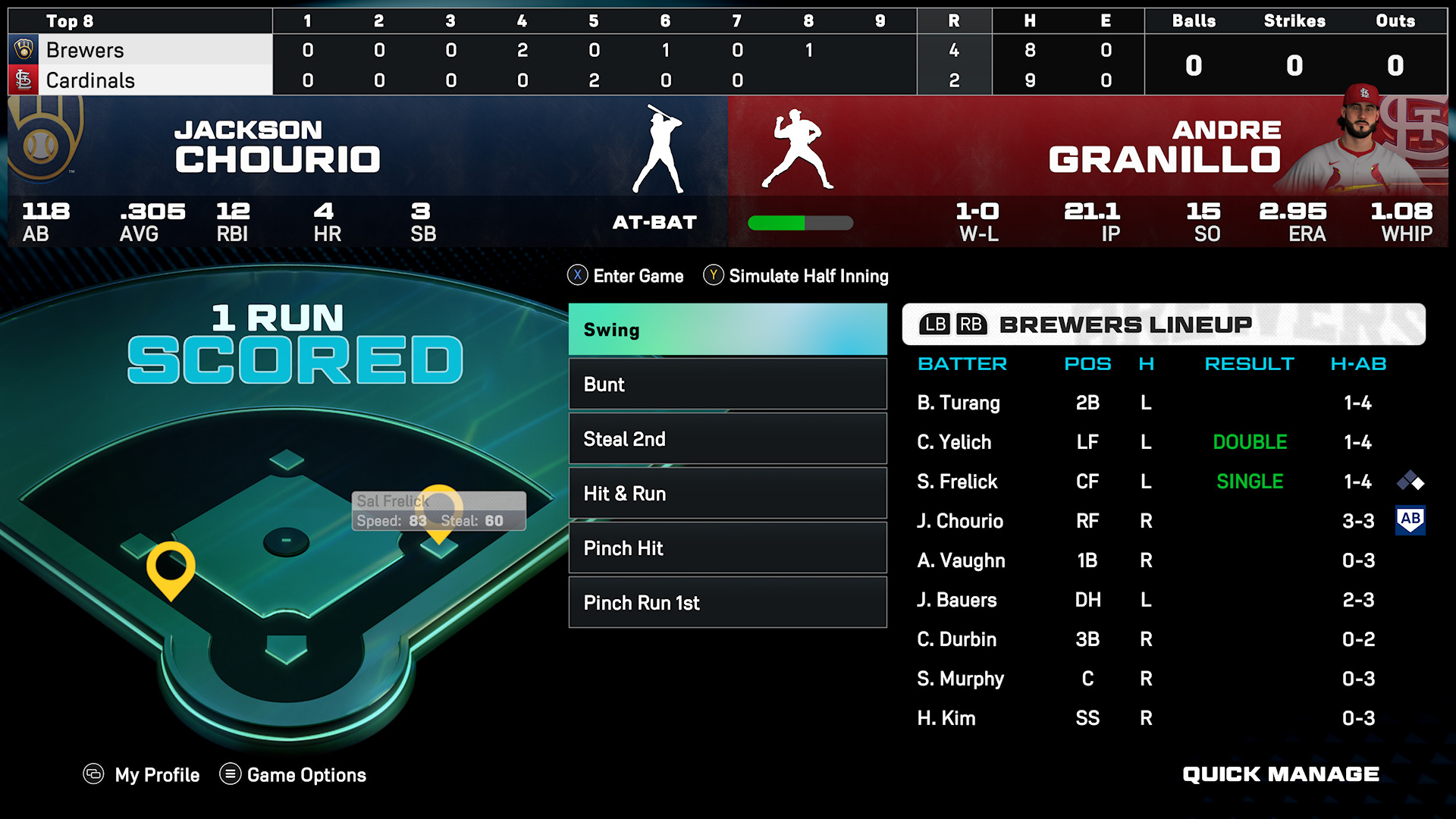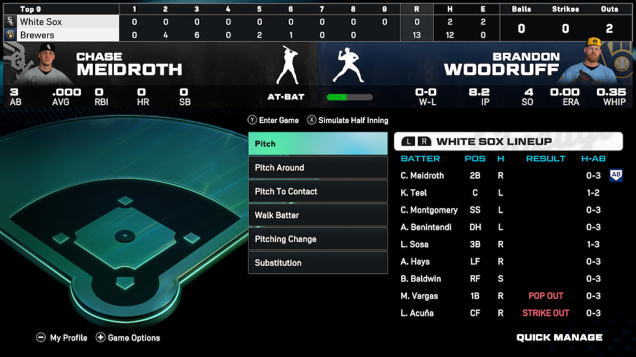 管理する要素を絞り込んで、より効率良くプレイできます。プレイヤーは出場選手や打順の決定、全体の作戦などを決定しますが、試合自体は選手たちが自動で進めます。試合中、通常モードと Quick Manage はいつでも任意に切り替えられます。