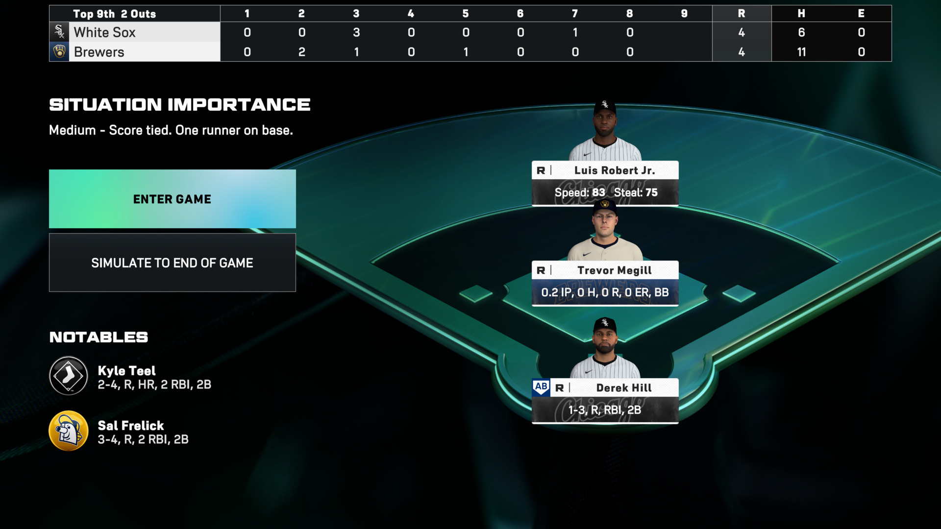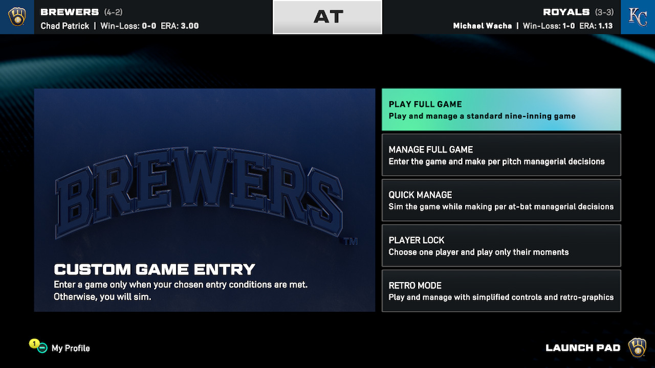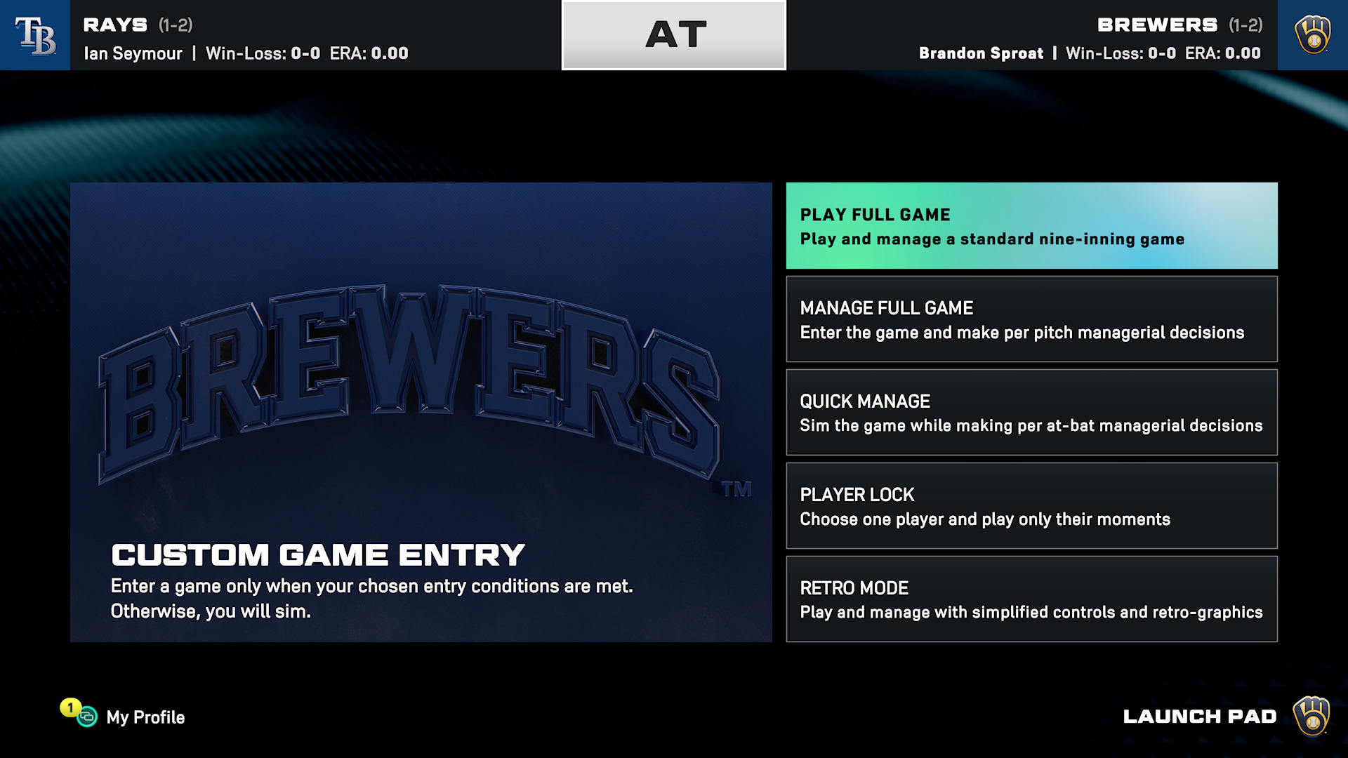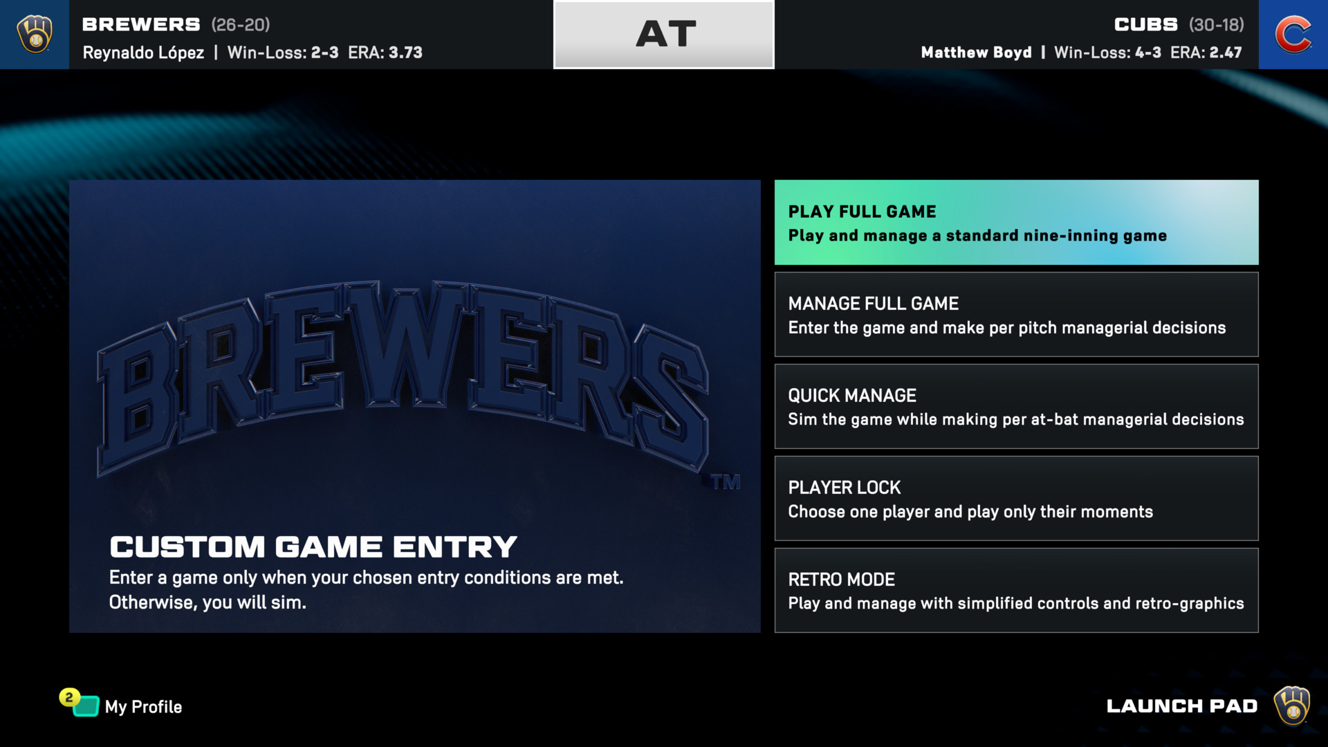 Custom Game Entry では、自分で設定した条件に基づいて、試合の重要な場面からプレイを開始できます。終盤戦や選手のマイルストーン達成がかかる場面、5回以降の接戦など、さまざまな条件を指定して参戦タイミングを決定できます。いつ試合に加わるかは、すべてあなた次第です!