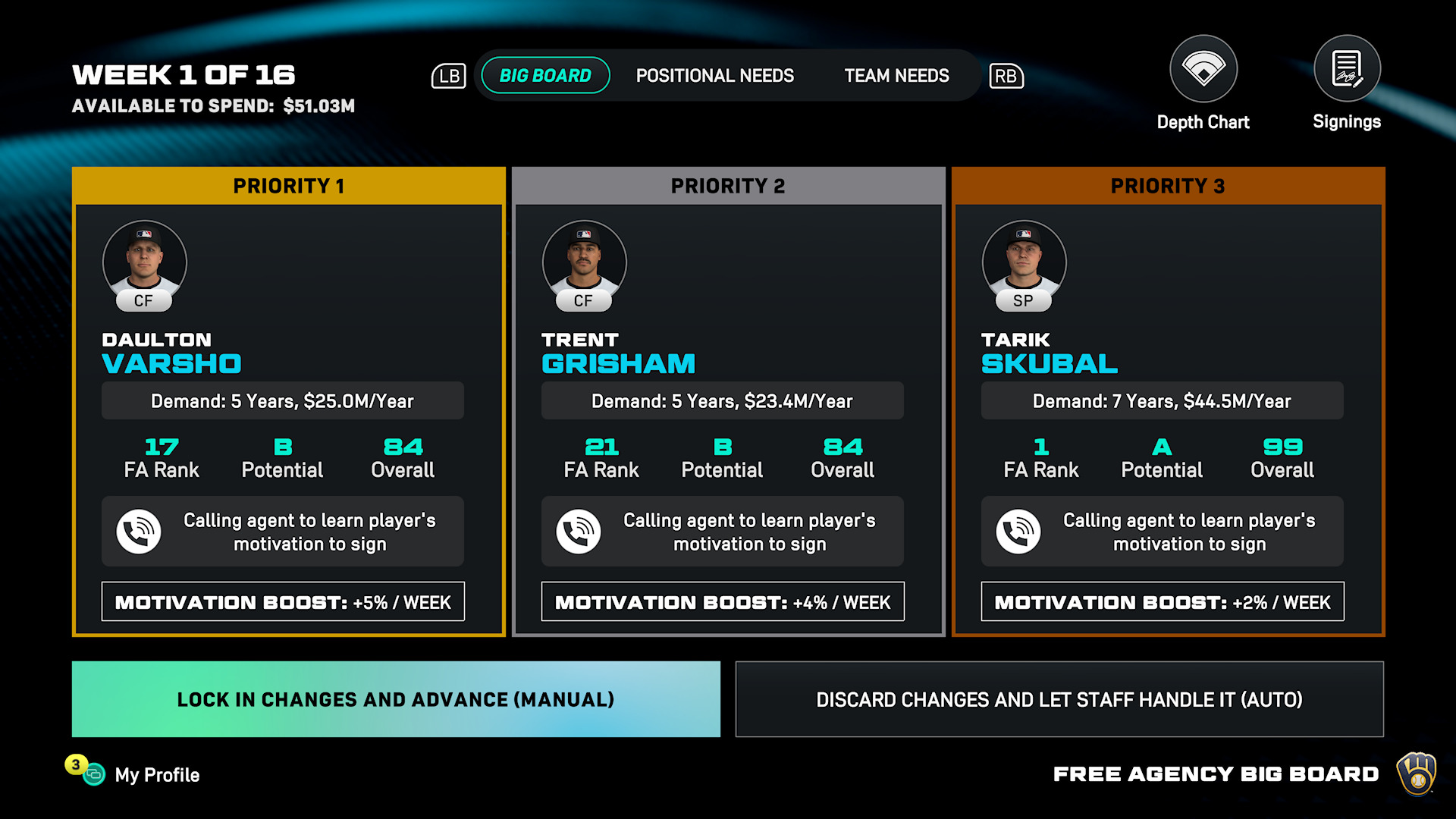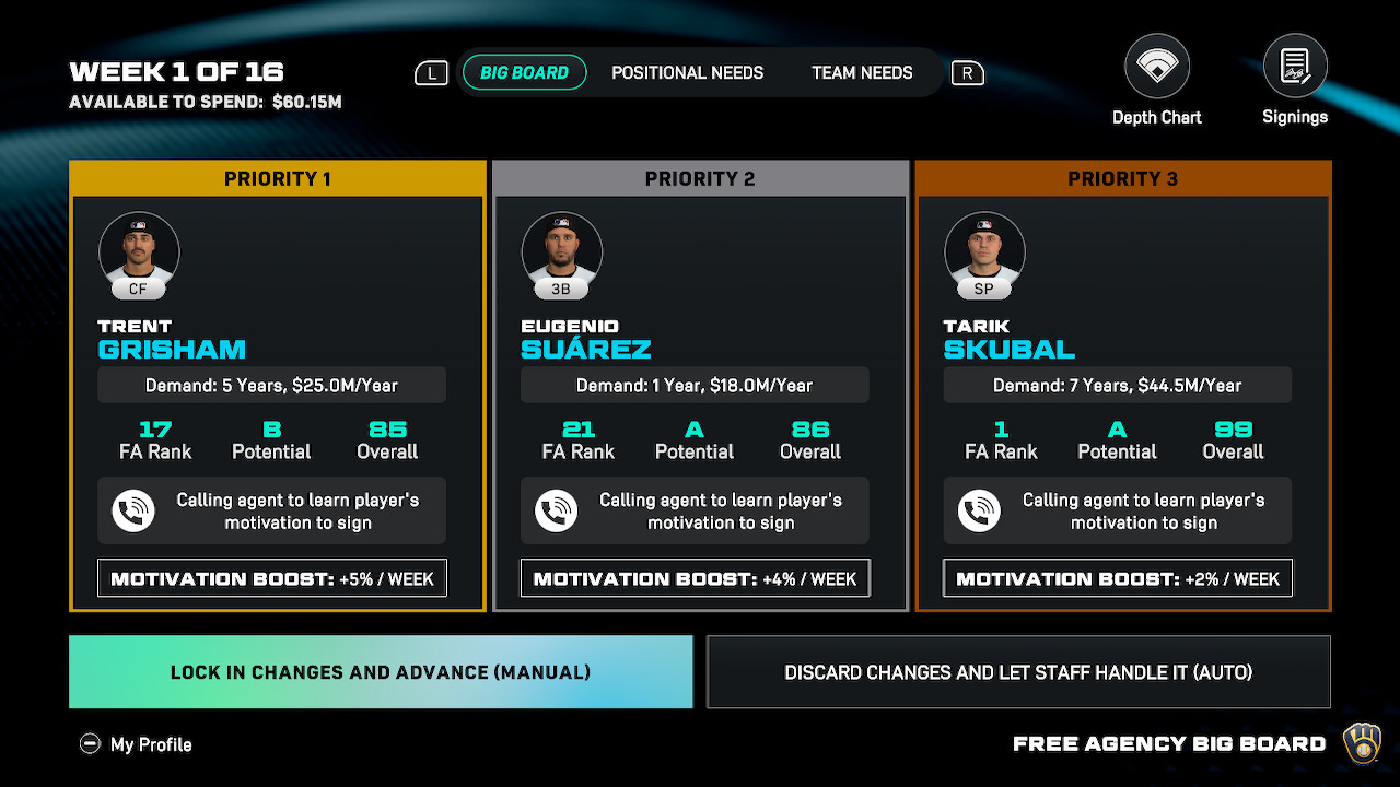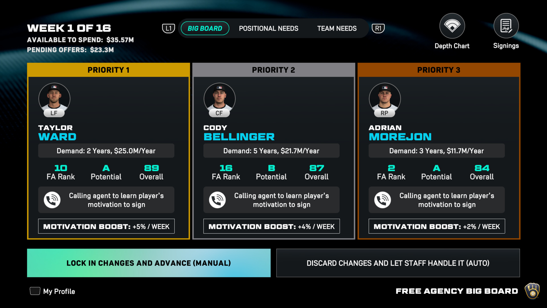 優勝には綿密な計画が欠かせません。Big Board は、オフシーズンにおけるあなたの戦略をまとめる中核となる機能です。獲得を目指す選手を設定し、代理人と交渉を進め、契約条件を調整していきます。チームに足りない最後のピースを見つけ出し、優勝へと近づきましょう。