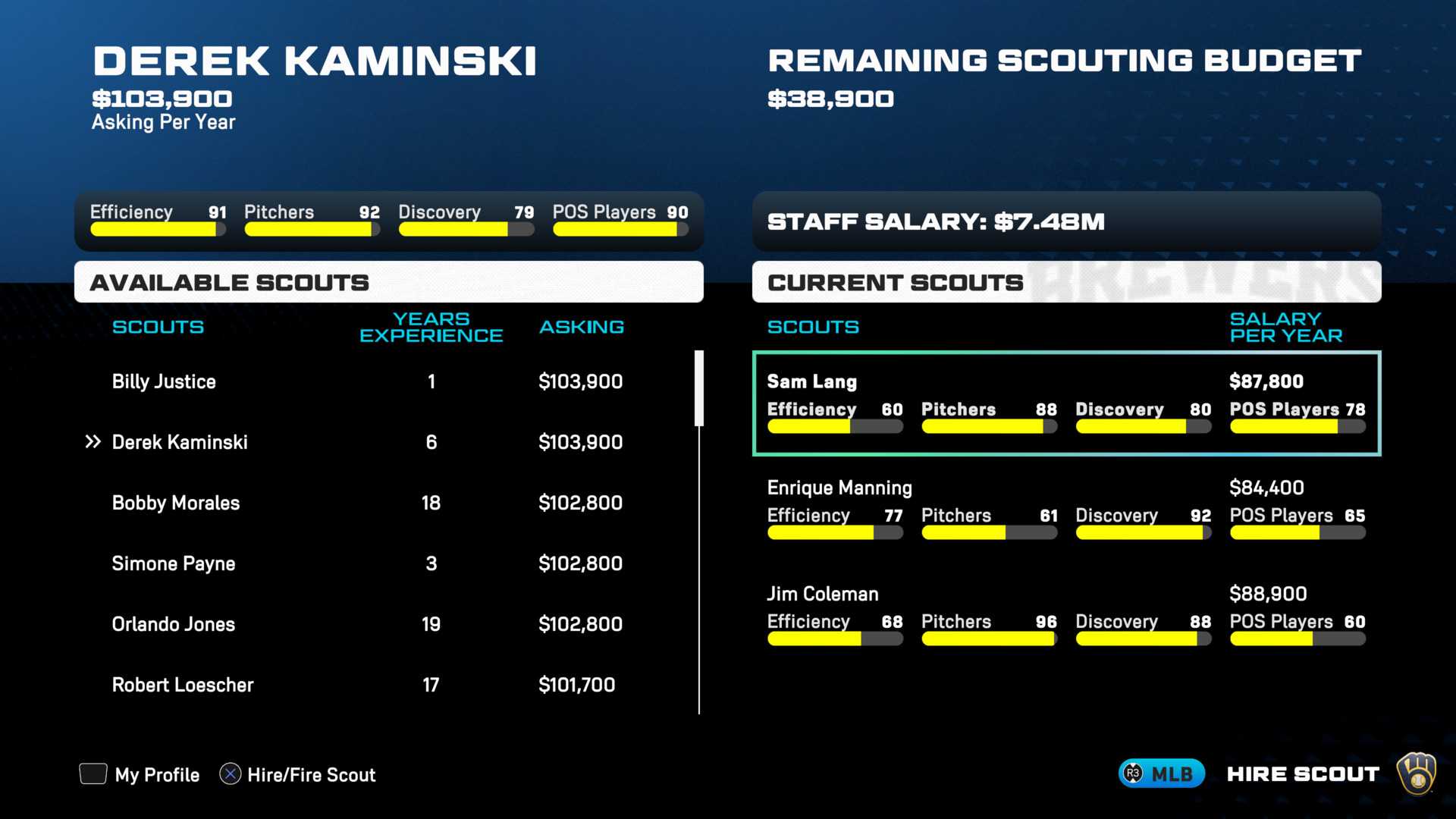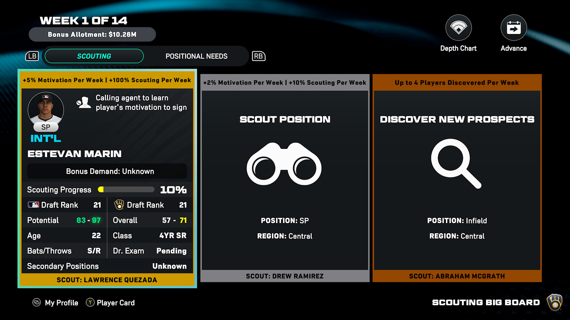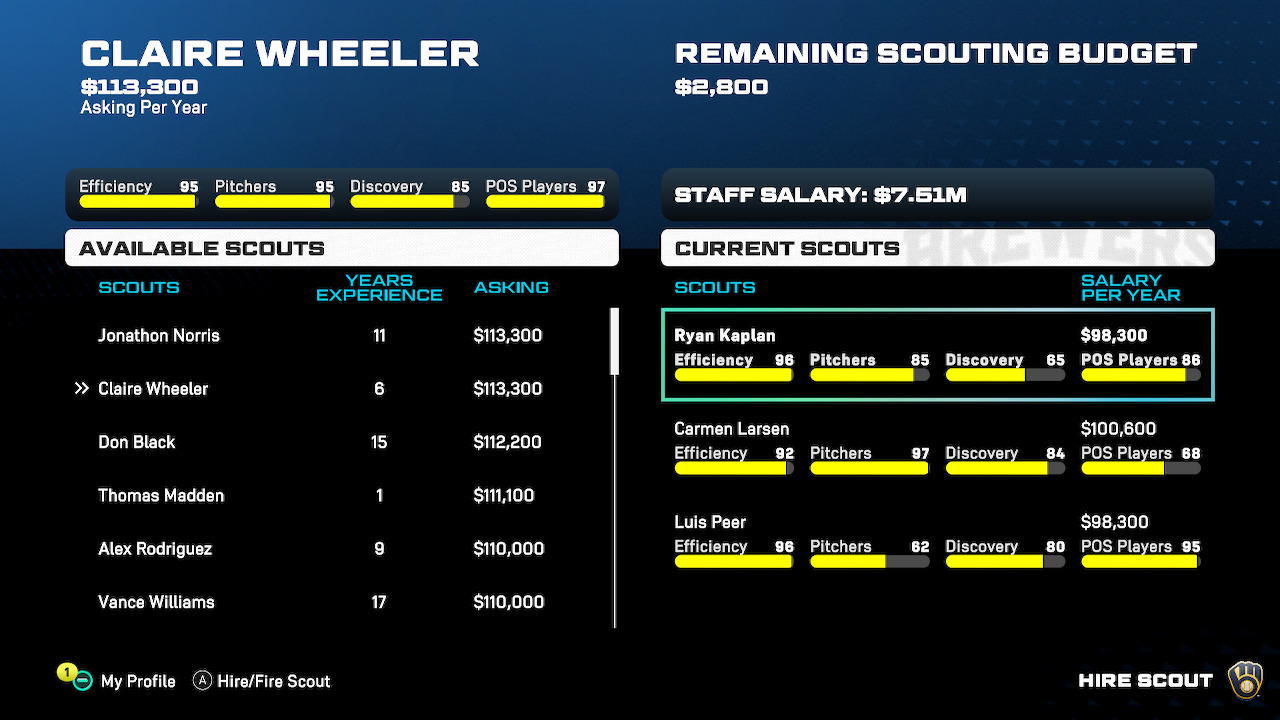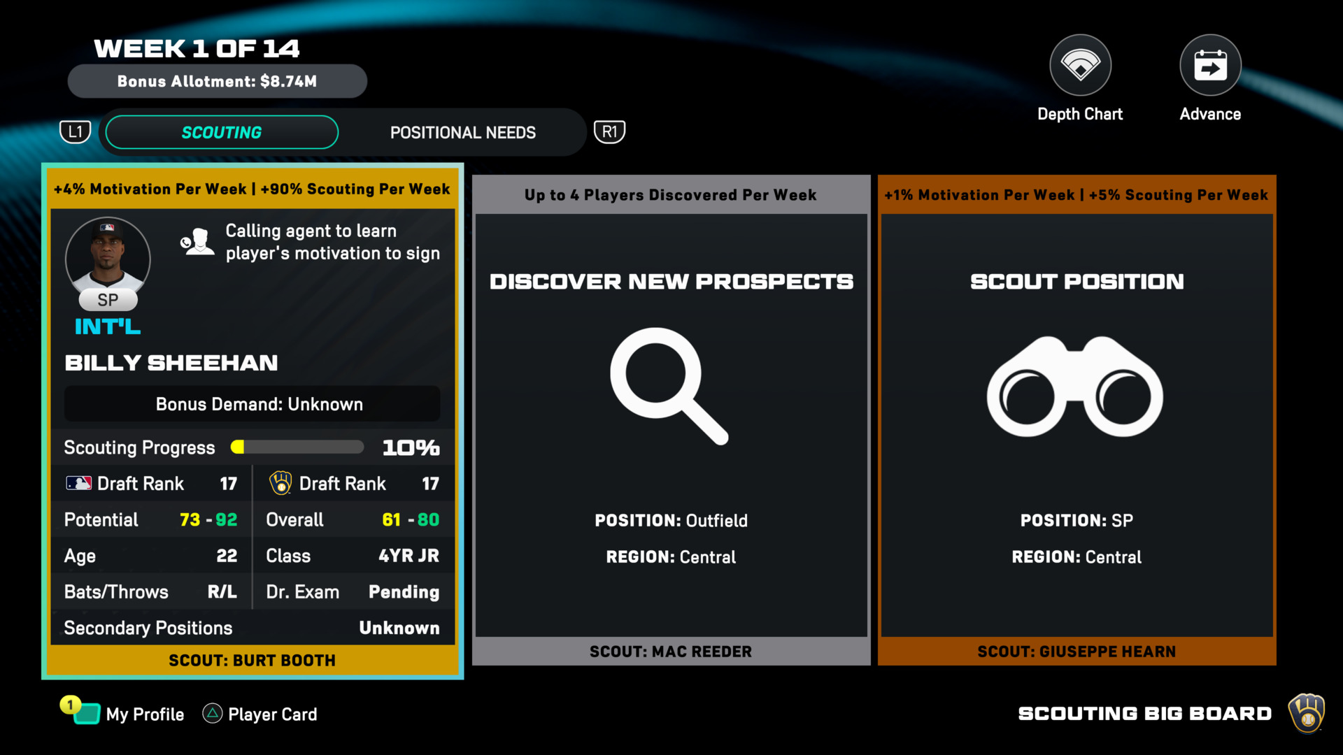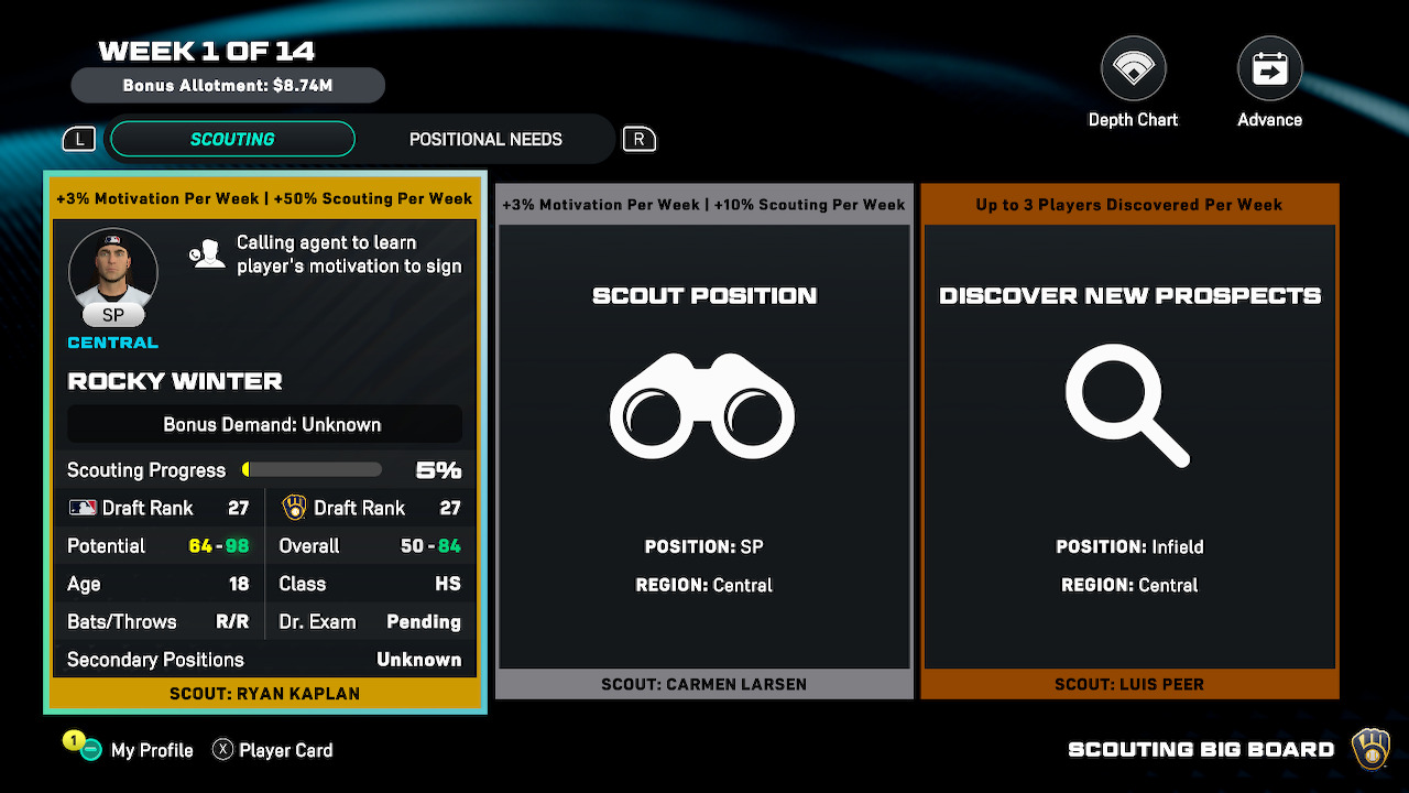 各スカウトはそれぞれ異なる能力や適性を持っています。優れた GM は、その強みを見極めて最大限に活用します。見落とされがちな逸材を発掘する力、迅速かつ正確なスカウティングレポートの作成、あるいは特定ポジションに関する深い専門知識など、それぞれの特性を活かすことが重要です。特定の選手を重点的に調査させることも、特定の地域でひとつのポジションに絞って有望株を探らせることもできます。シーズン序盤、ドラフト前の期間には、毎週スカウティング計画を設定することができます。