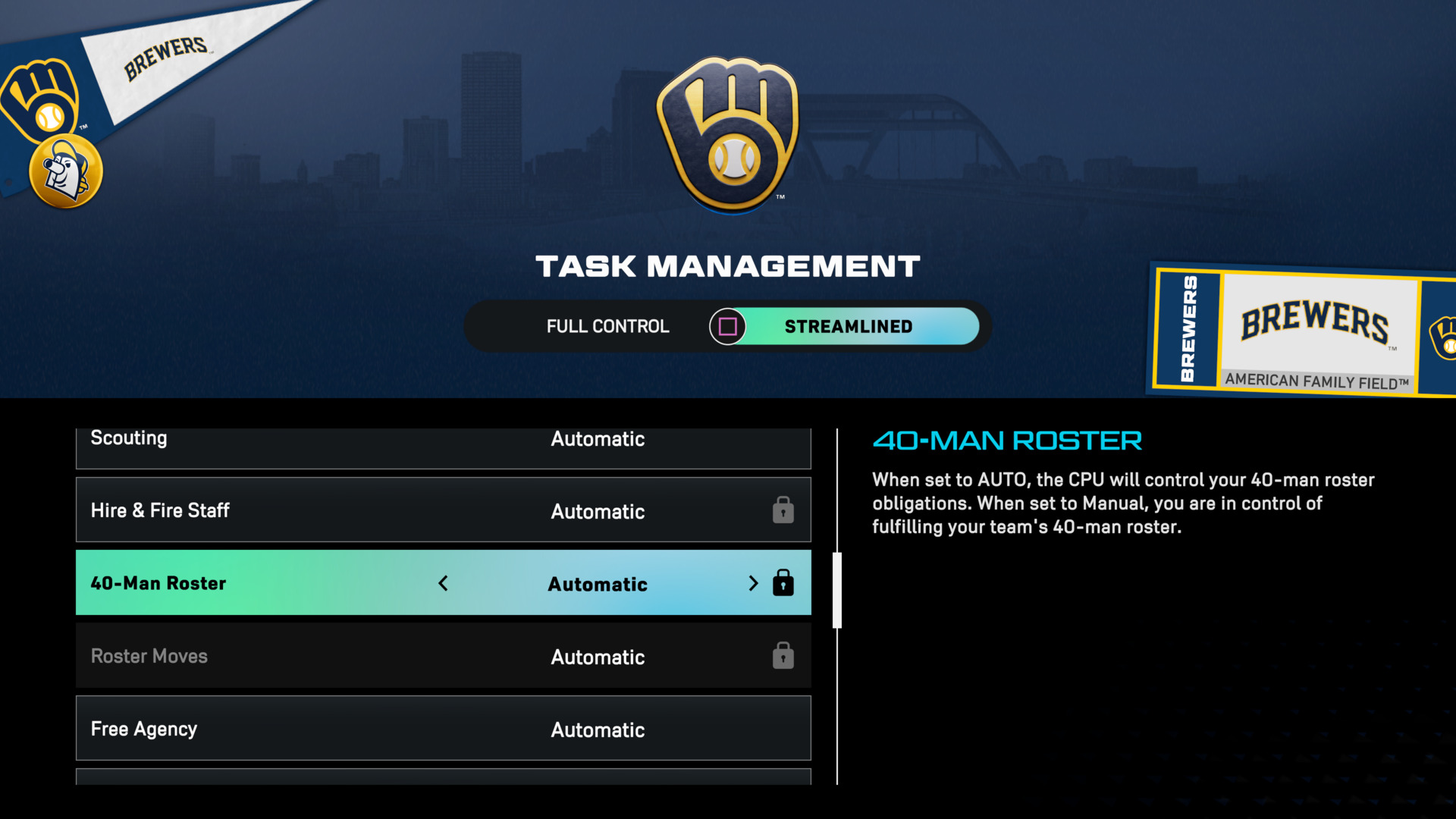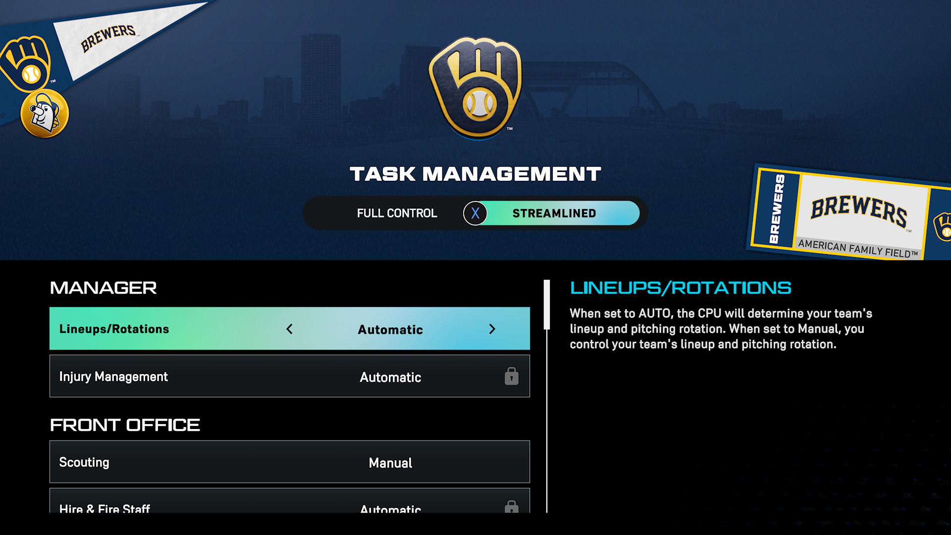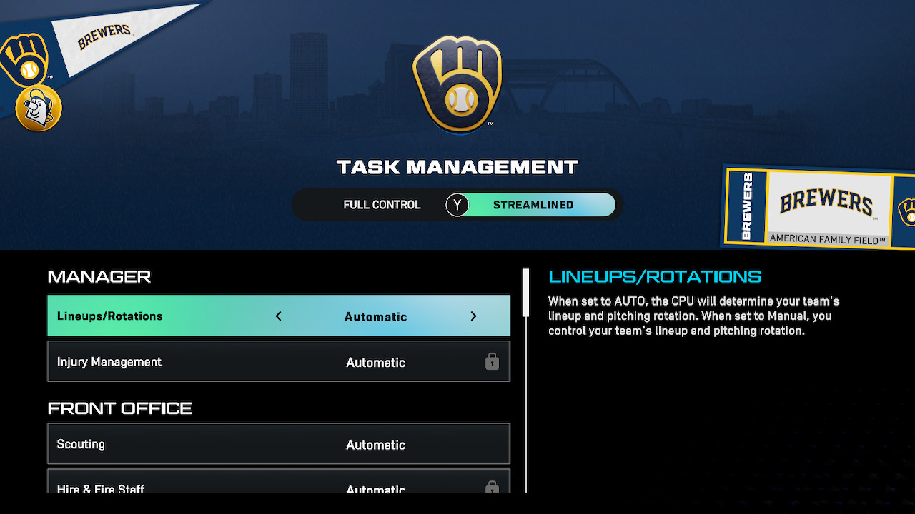 Streamlined(간소화된 경험)은 팀 빌딩의 가장 중요한 요소를 여전히 플레이어가 담당하며, 간략하지만 빠르고 부드럽게 작동합니다. Full control(전체 제어)는 프랜차이즈의 모든 부분에 대한 최종 결정을 내릴 수 있도록 하여 오늘날 게임에서 가장 심도 있고 완전히 커스터마이즈를 할 수 있는 운영 경험을 제공합니다!